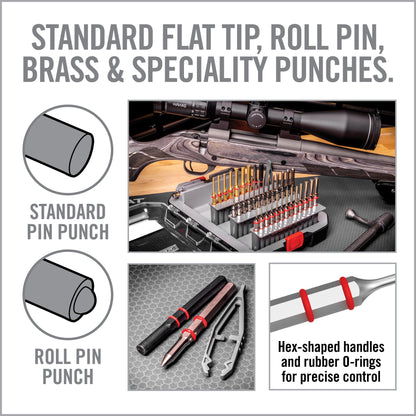 The Accu-Punch® Master Set is a 37-piece collection of standard, roll pin, brass, and specialty punches, designed specifically for firearm maintenance. With durable nickel-plated steel punches and non-marring brass options, this set provides the tools necessary for delicate and demanding tasks alike. The included proprietary Pin Alignment Tool simplifies the insertion of tiny pins, ensuring precision and efficiency. Each punch is hex-shaped with rubber O-rings for a secure, non-slip grip, and the entire set is housed in an organized, easy-access flip-up case.