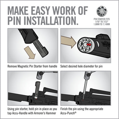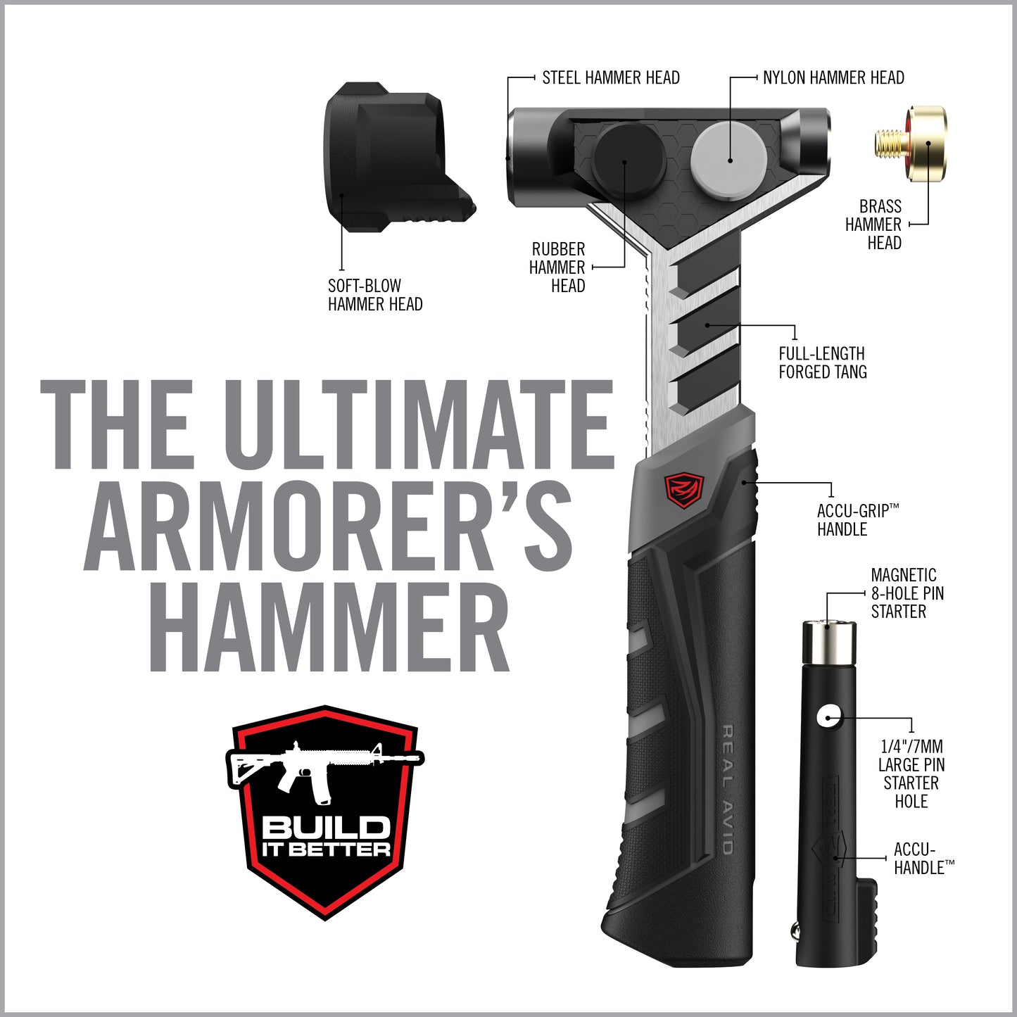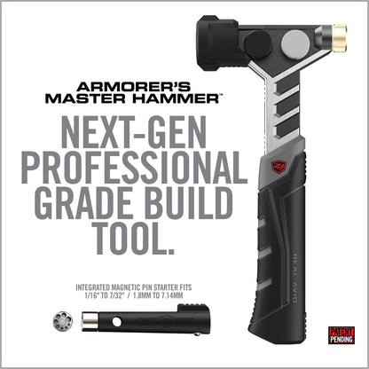 The Armorer’s Master Hammer™ is engineered to deliver controlled force for a wide range of firearm assembly and modification tasks. With its ergonomic handle and forged steel construction, this hammer ensures perfect balance and precision. The modular design features interchangeable heads—including steel, brass, nylon, rubber, and soft-blow options—making it adaptable to delicate adjustments or heavy-duty jobs. Its integrated magnetic pin starter allows for hands-free pin placement, accommodating pins ranging from 1/16" to 7/32" (1.8mm to 7.14mm), streamlining the assembly process.