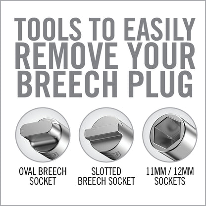 The kit also includes a double-ended spanner wrench and a set of specialized sockets, including 11mm, 12mm, slotted and oval breech sockets. These tools are ideal for loosening or tightening breech plugs securely, even in stubborn or fouled conditions. Additionally, the ¼" socket breaker bar and its extensions provide extra leverage for removing tightly seated plugs. With durable construction and compatibility across a wide range of muzzleloader models, these tools are essential for ensuring proper breech plug function and preventing damage during maintenance.