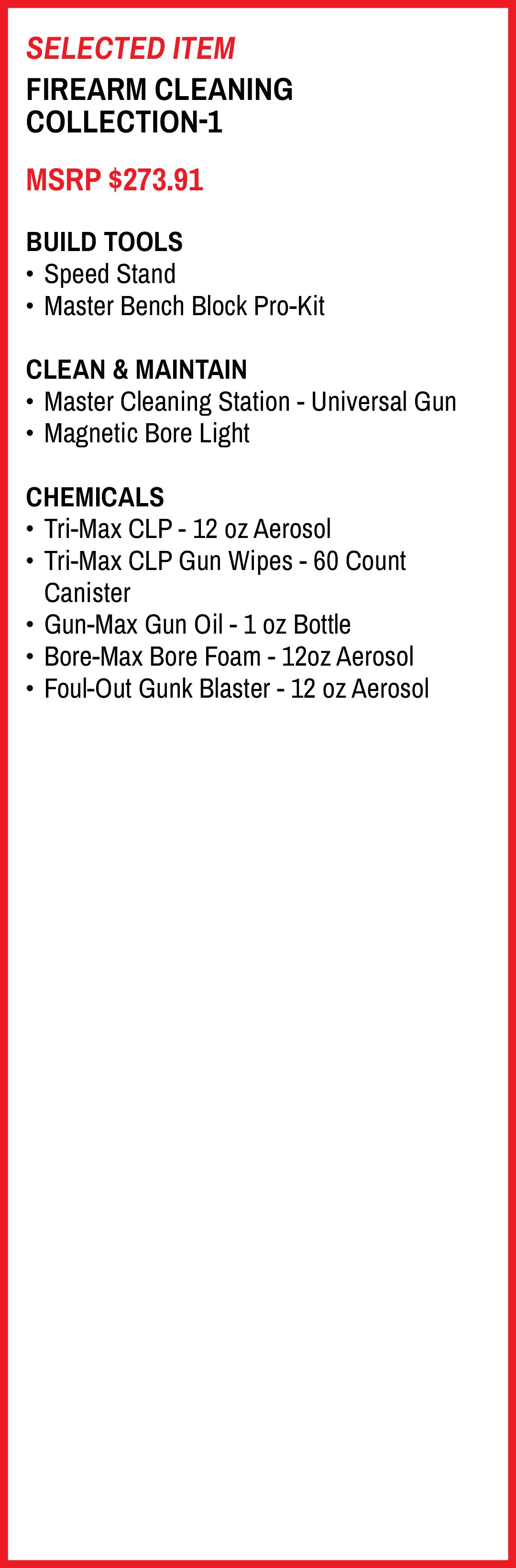 This essential firearm cleaning collection provides a comprehensive set of tools and products to keep your guns in top condition. The Bore-Max® Bore Foam and Foul-Out® Gunk Blaster work together to effectively remove fouling and buildup from your firearm's bore, while the Gun-Max® Gun Oil lubricates and protects critical components. The included Magnetic Bore Light™ ensures you can easily inspect the bore for any remaining debris. For a stable work surface, the Master Bench Block® Pro-Kit and Master Cleaning Station® provide a secure platform for disassembly and cleaning. The Speed Stand™ offers additional support during maintenance tasks. Tri-Max CLP®, available in both aerosol and convenient gun wipes, is a versatile cleaning, lubricating, and protecting solution that keeps your firearms functioning reliably.