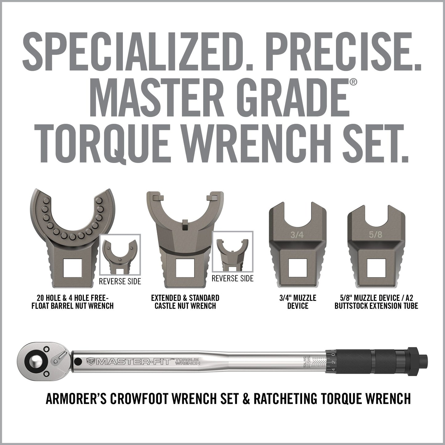 This crowfoot wrench set is specialized for precise fitment and manipulation of A2 barrel nuts, buttstocks, muzzle devices and castle nuts. The titanium-coated stainless steel construction provides tight tolerances for solid gripping strength and enhanced no-slip fitment. Paired with the heavy-duty Master-Fit Torque Wrench, it takes Gun DIY® building to a new level of Master Grade® quality and precision.