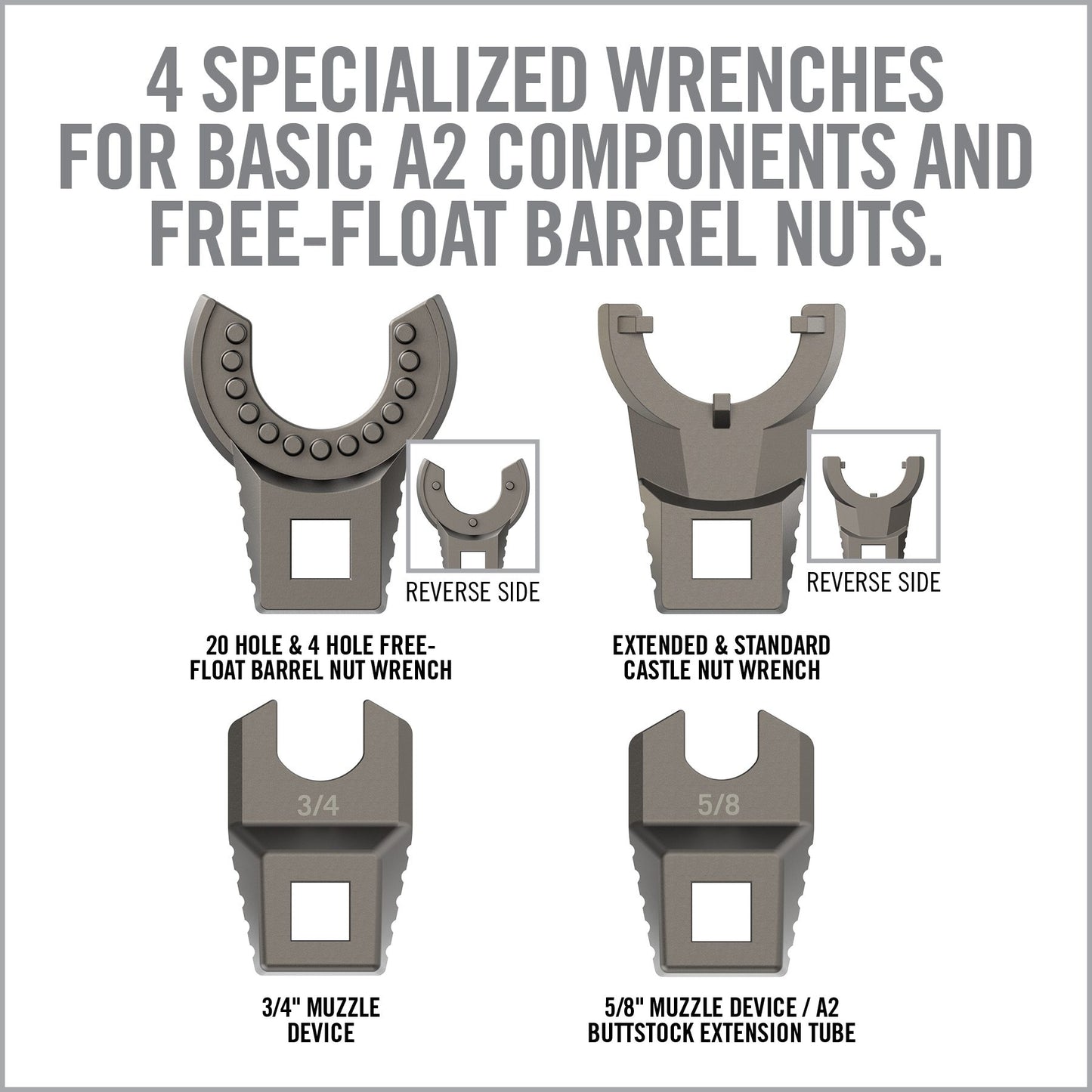 - The set includes 4 specialized wrenches for basic A2 components and Free-Float barrel nuts: 20 Hole & 4 Hole Free-Float Barrel Nut wrench, Extended & Standard castle nut wrench, 3/4” Muzzle device wrench, 5/8” Muzzle device wrench / A2 Buttstock extension Tube wrench.