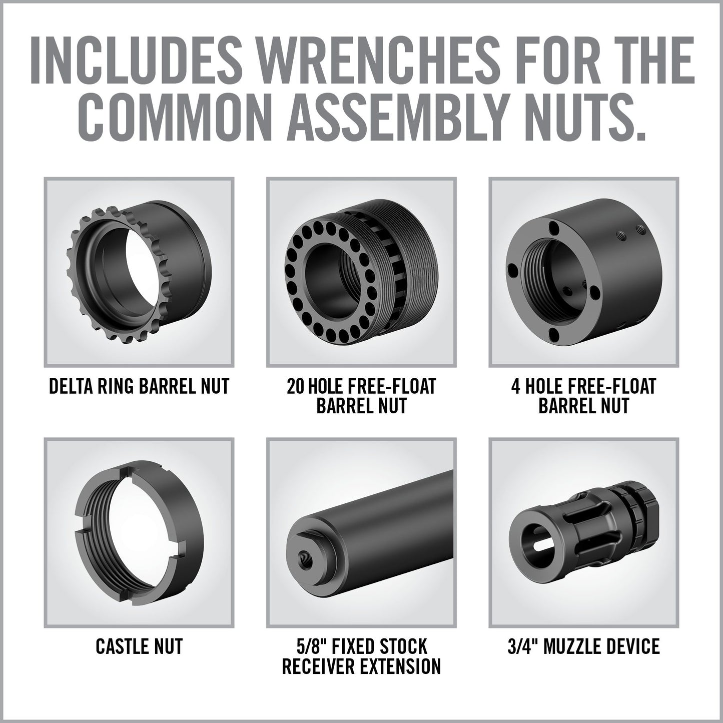 - The set includes 4 crowfoot builder wrenches and a heavy-duty 1/2” torque wrench that fit the most common A2-style AR15 assembly nut sizes.