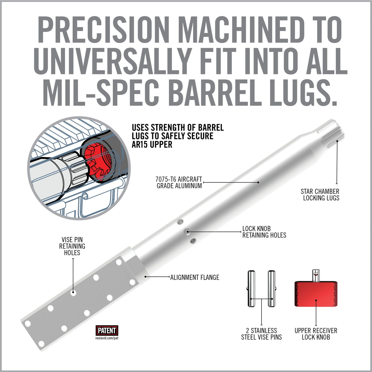 - Lug-Lok Upper Vise Block™ - AR15 leverages AR barrel extension lugs for secure, stable maintenance of upper receivers.