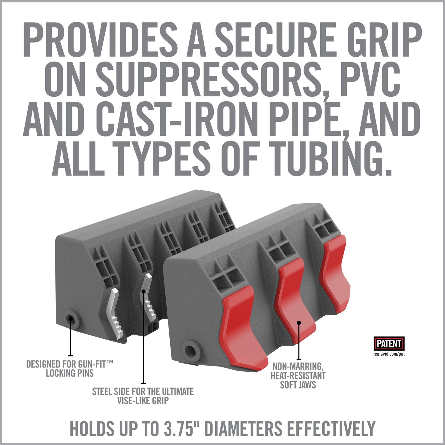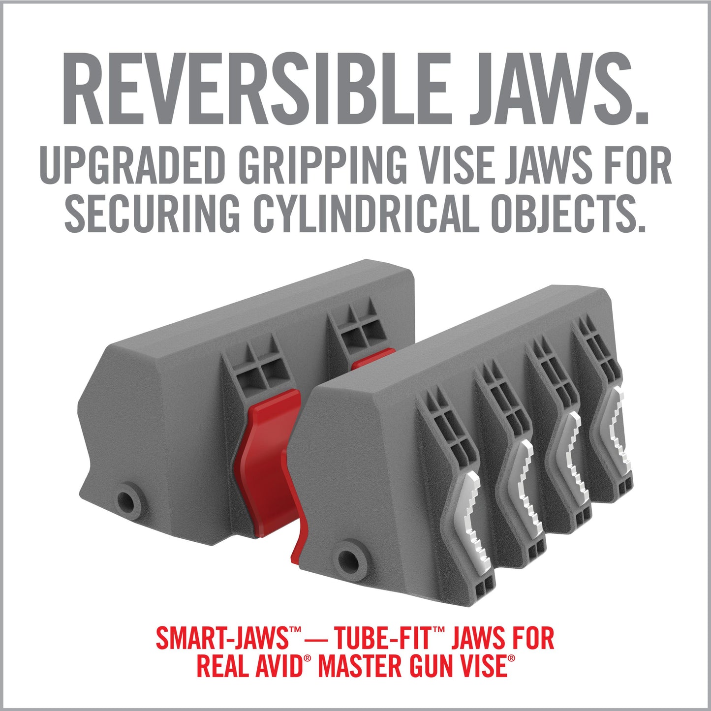 Expanding the functionality of the Master Gun Vise are the Smart-Jaws™ — Multi-Fit™ and Tube-Fit™ Vise Jaws. These jaws are engineered to offer secure, damage-free handling of various firearm components. The Multi-Fit Vise Jaws, with their reversible design, textured flat surface and eight distinct grooves, accommodate a wide array of firearm parts, ensuring a firm grip without the risk of damage. The Tube-Fit Vise Jaws, on the other hand, are specifically designed for cylindrical objects like suppressors, providing a non-marring, heat-resistant grip.