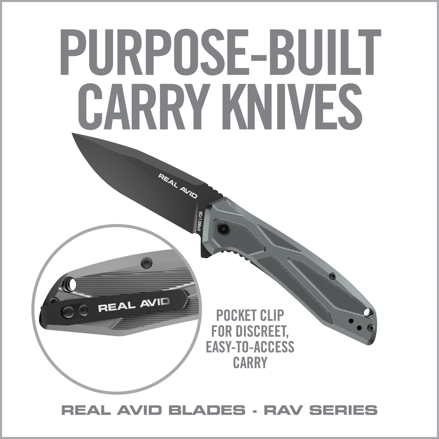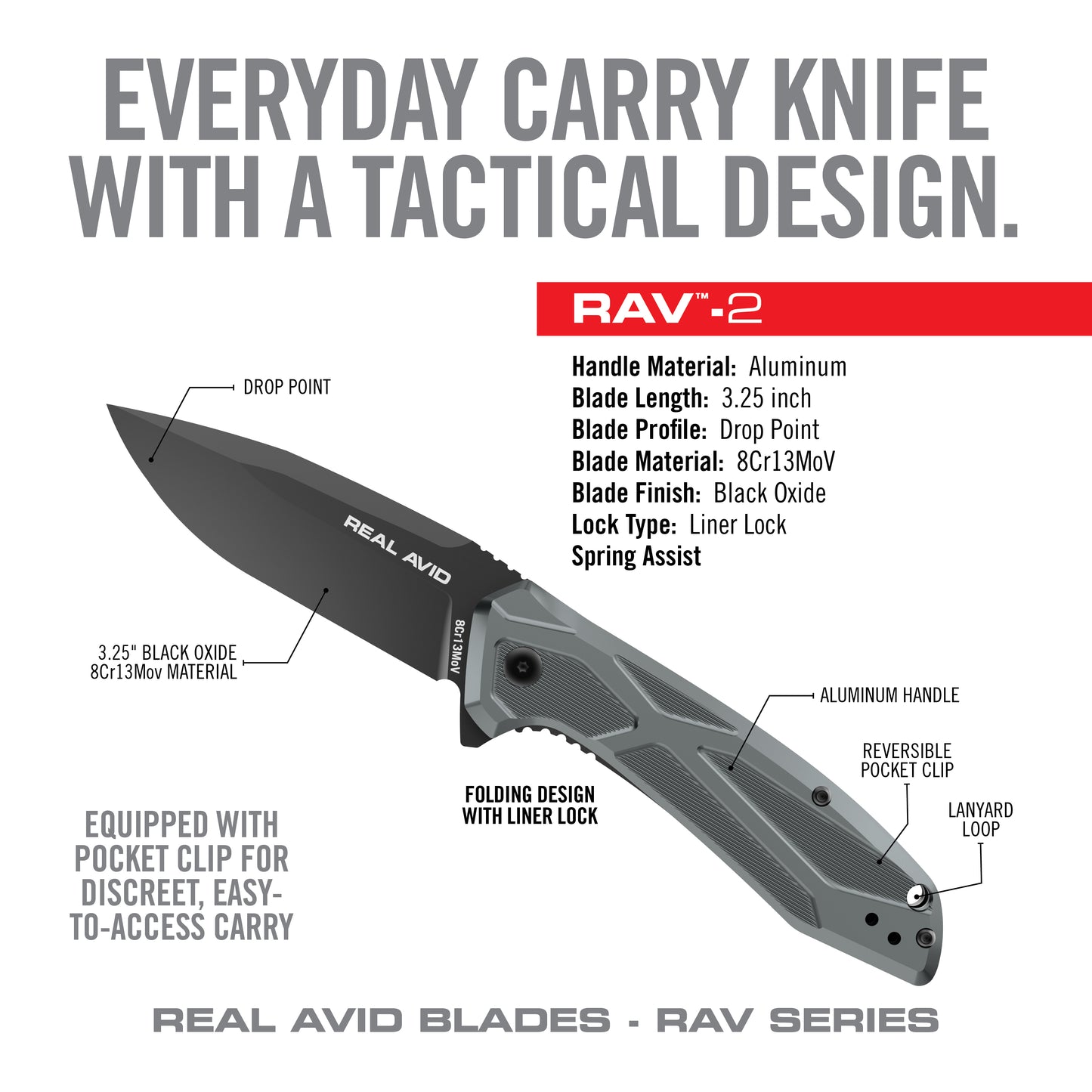 The RAV-2 from the Rav Series by Real Avid Blades. Built for readiness, this purpose-built carry knife features an aluminum handle and a 3.25-inch drop point blade made of 8Cr13MoV with a black oxide finish. Engineered with a liner lock mechanism and spring assist, the RAV-2 ensures swift and secure deployment in any situation. Born from a culture of preparedness, Real Avid Blades are designed to confront life's challenges head-on. Grounded in proven real-world performance and driven by innovation, RAV Series knives embody reliability and functionality. From everyday tasks to unforeseen challenges, the RAV-2 is ready for whatever comes your way. Experience the true essence of readiness with the RAV-2 by Real Avid Blades.