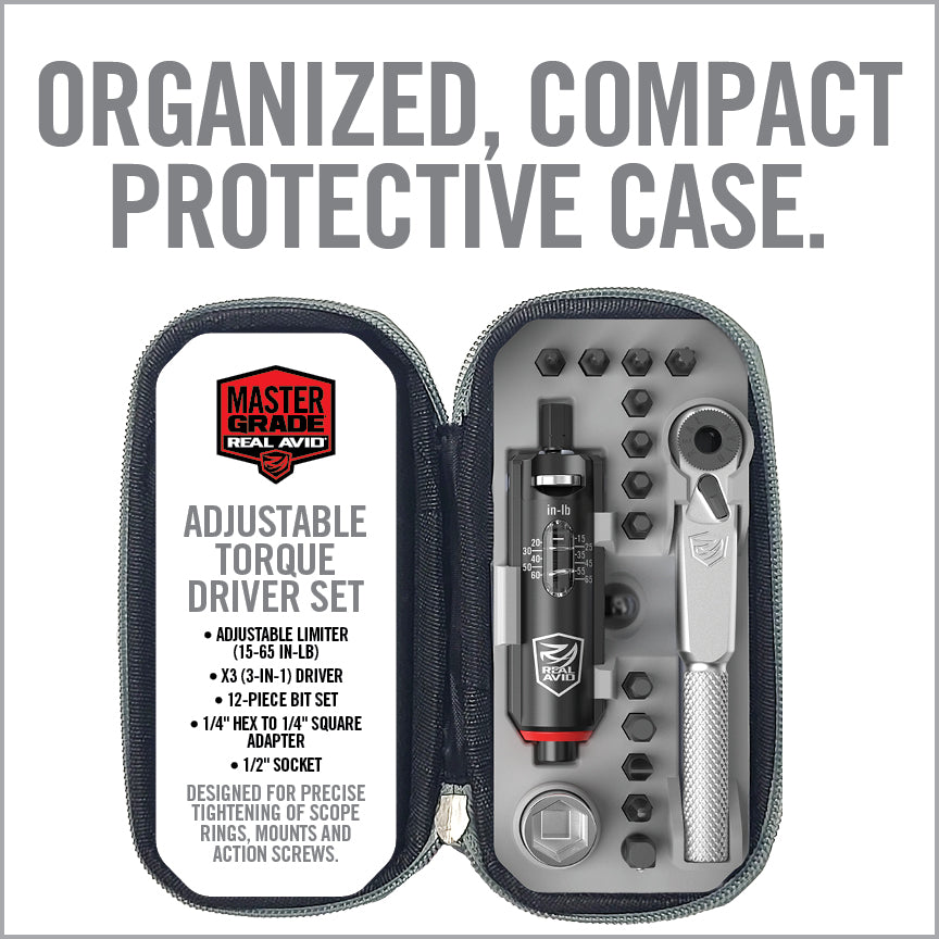 The Smart-Torq Adjustable Limiter & X3 Driver Kit is a precision-engineered toolset designed to meet the demands of professional gunsmiths and firearm enthusiasts. At the core of the kit is the Smart-Torq Adjustable Limiter, which provides precise torque settings from 15 to 65 in-lbs, adjustable in 1 in-lb increments. This ensures consistent and accurate tightening of scope rings, mounts and action screws, preventing damage caused by over-tightening. The locking, “click-style” overload clutch adds reliability by delivering a clear tactile and audible signal when the desired torque is reached, offering confidence with every adjustment.