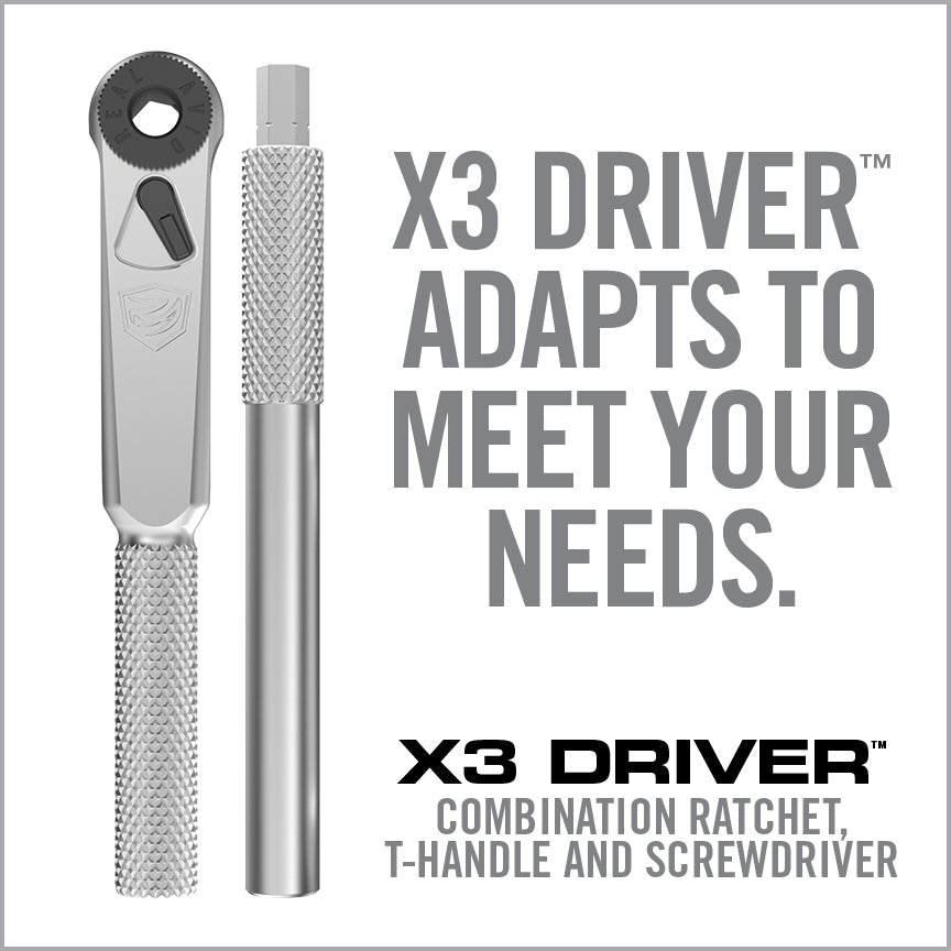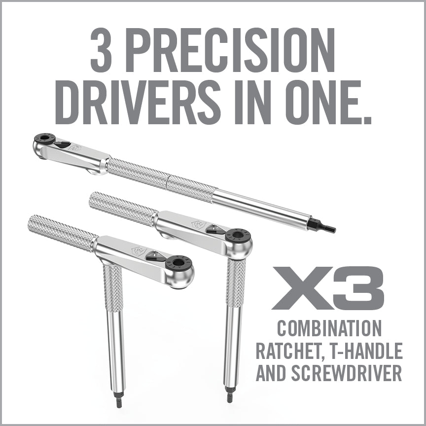 - X3 Driver™ combines a 72-tooth ratcheting driver, T-handle and screwdriver.