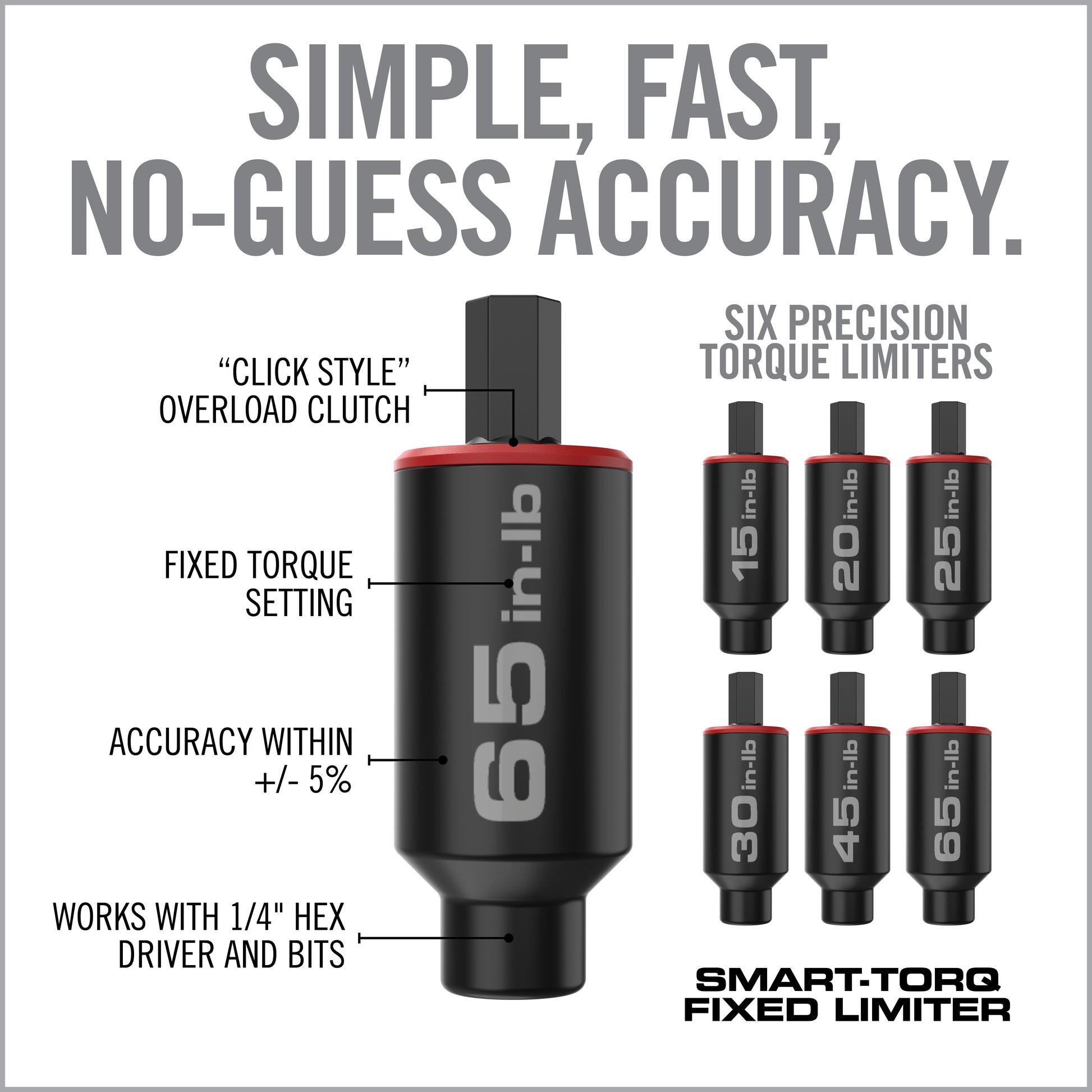 - Six Smart-Torq Fixed Limiters with settings of 15, 20, 25, 30, 45 and 65 in-lb.