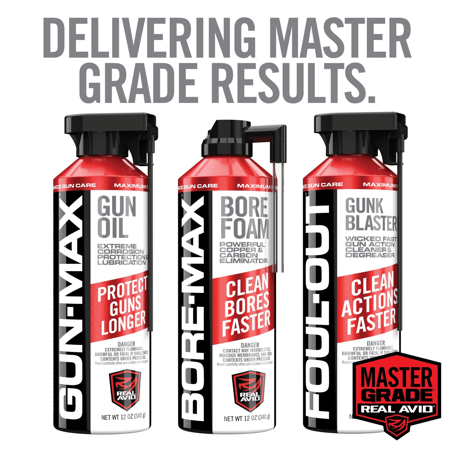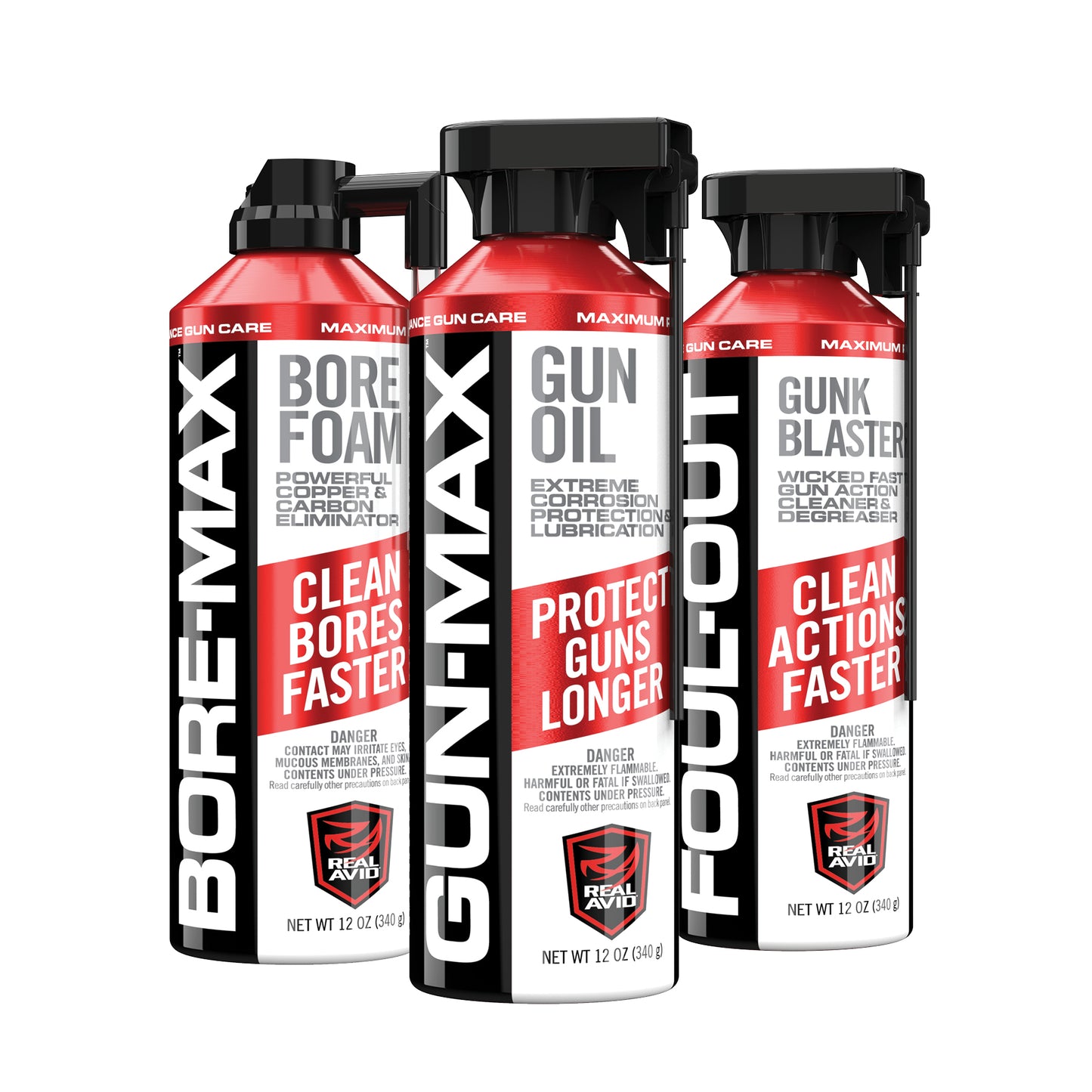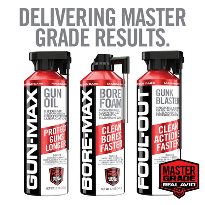This professional-grade firearm maintenance kit combines three specialized aerosol solutions for complete firearms care. The Gun-Max Oil provides superior corrosion protection and friction reduction, while Bore-Max Foam's expanding action effectively dissolves copper and carbon deposits. Foul-Out Gunk Blaster completes the system with rapid-acting cleaning power for actions and mechanisms. Each 12oz aerosol features precision application systems and advanced formulations designed for modern firearms, delivering Master Grade® results without harsh chemical odors.